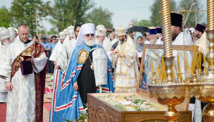 По заамвонной молитве архипастыри и сослужащие священнослужители совершили славление перед мощами святого праведного Иоанна Кормянского.