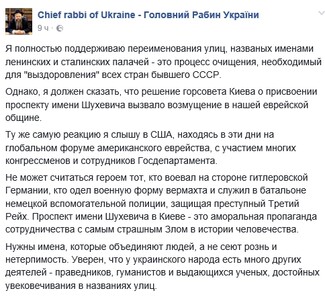 «Не может считаться героем тот, кто воевал на стороне гитлеровской Германии, кто одел военную форму вермахта и служил в батальоне немецкой вспомогательной полиции, защищая преступный Третий Рейх. Проспект имени Шухевича в Киеве – это аморальная пропаганда сотрудничества с самым страшным злом в истории человечества», – написал на своей странице в Facebook главный раввин Украины Моше Реувен Асман.