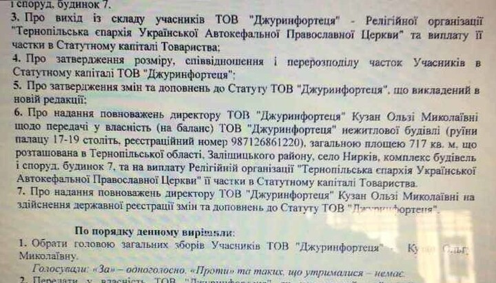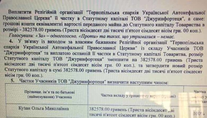 31 октября 2016 года архиепископ Мстислав (Гук) подписал документы о выходе Тернопольской епархии из состава ООО «Джуринфортеця» и передаче полномочий директору общества Ольге Кузан. При этом Тернопольская епархия забирала свой уставной капитал – 382 тысячи 578 грн.