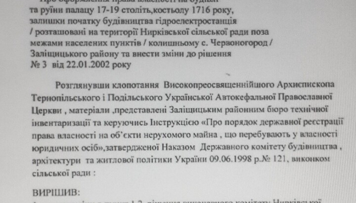 Журналисты приводят документы, согласно которым памятник архитектуры был передан предстоятелю УАПЦ Мефодию еще во времена президентства Леонида Кучмы для размещения там мужского монастыря святых апостолов Петра и Павла. Согласно свидетельству о праве собственности от 22 января 2002 года, руины Дворца принадлежали Тернопольско-Подольской епархии УАПЦ.