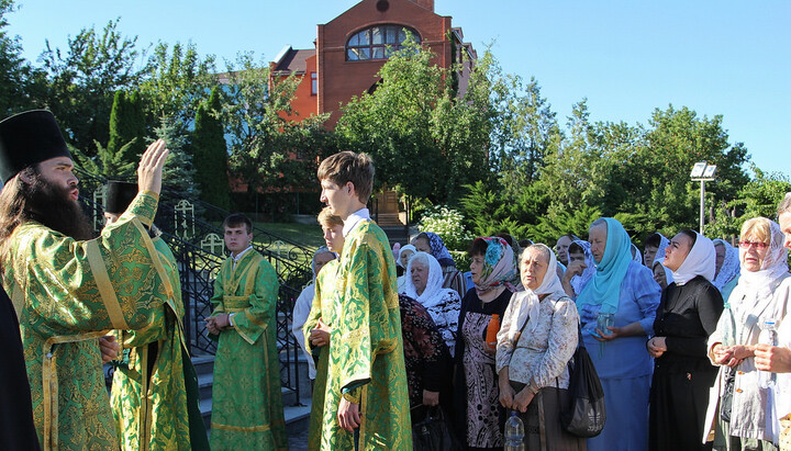 В это время на улице совершался водосвятный молебен с акафистом преподобному Сергию, игумену Радонежскому, чудотворцу. Молебен совершил архимандрит Феофан (Люкшин), казначей Святогорской обители, духовник Свято-Георгиевского скита в селе Долина, в сослужении архимандрита Арсения (Ванюшина) и иерея Сергия (Кудрика), священника села Высокополье Харьковской епархии.