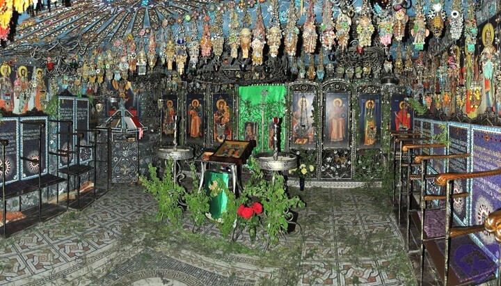 Церковь находится в бывшей штольне по добыче извести, там всегда сыро и влажно, поэтому в скиту не держатся ни штукатурка, ни краски – отсюда и использование бисера для украшений.