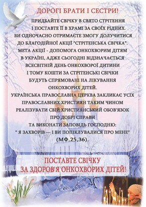 В этот день каждый, кто купит свечу в храме УПЦ, тем самым пожертвует на лечение маленьких пациентов онкогематологического отделения Киевской областной клинической больницы и онкологического отделения Национальной детской специализированной больницы «ОХМАТДЕТ».