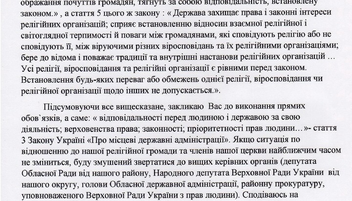 По мнению настоятеля храма, своими действиями чиновница нарушает Конституцию, и сообщает, что если она не прекратит давление на верующих, громада будет вынуждена обратиться в высшие инстанции государственной власти.