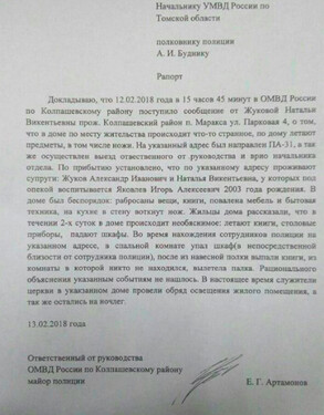 «В доме был беспорядок: разбросаны вещи, книги, повалена мебель и бытовая техника, на кухне в стену воткнут нож. Во время нахождения сотрудников полиции на указанном адресе в спальной комнате упал шкаф (в непосредственной близости от сотрудника полиции), после из навесной полки выпали книги, а из комнаты, в которой никого не было, вылетела палка. Рационального объяснения указанным событиям не нашлось», – говорится в рапорте.