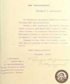 Среди писем – Синодальная Грамота за подписью митр. Владимира (Богоявленского) от 30 сентября 1914 о награждении игумена Ильинского скита на Афоне архимандрита Максима (+ 11 июня 1919). Также представлены письма митрополита Владимира (Богоявленского) игумену Русского на Афоне Свято-Пантелеимонова монастыря схиархимандриту Мисаилу (Сапегину, 1852–1940) за 1912–1914 гг.